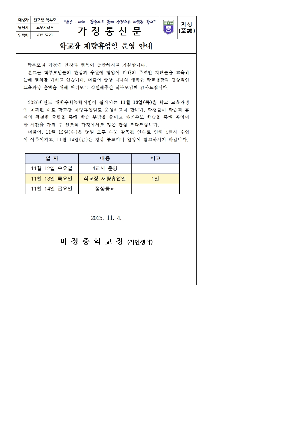 학교장 재량휴업일(11월13일 목요일) 운영 안내
